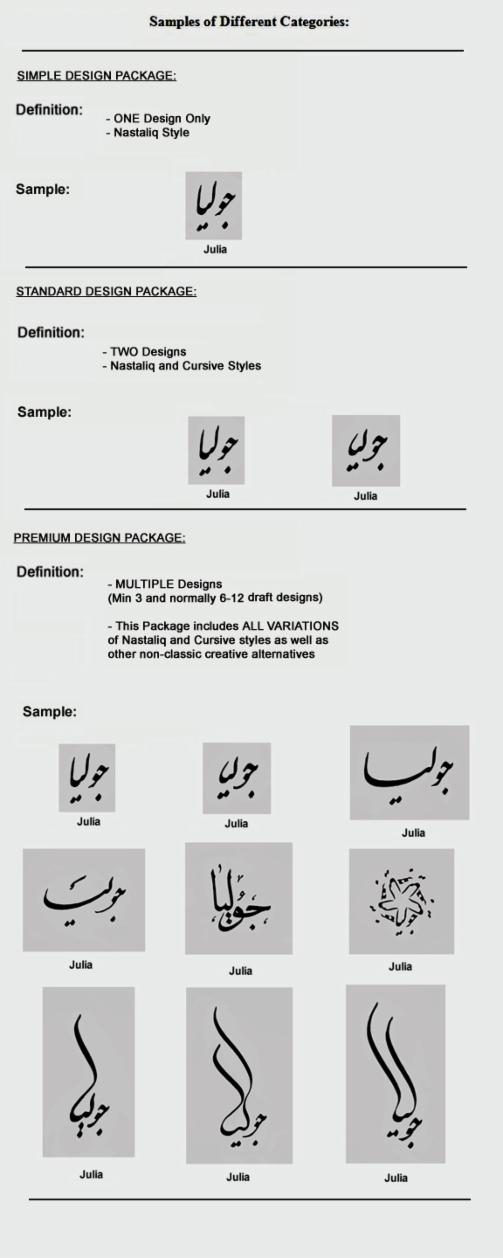 We offer three types of calligraphy services: 1. Simple Design, 2. Standard Design, 3. Premium Design. Here is the definition of each category and our pricing list for your information: