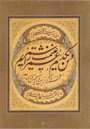 Amirkhani: His full name is Qolam-Hussein Amirkhani and he was born in 1939. He is president of Iranian Calligraphers Committee and the most prominent contemporary master in Nas’taliq style. Amirkhani attended Hassan Mir-Khani and Hussein Mir-Khani's calligraphy classes until he mastered Nas’taliq and now it is more than 40 years that he teaches calligraphy in the Iranian Calligraphers Committee. He also has authored 12 books about Persian Calligraphy and conducted numerous international art exhibits. He is currently authoring a new comprehensive calligraphy book in which he explains his techniques in Nas’taliq . This book will be about 200 pages and soon will be released.
